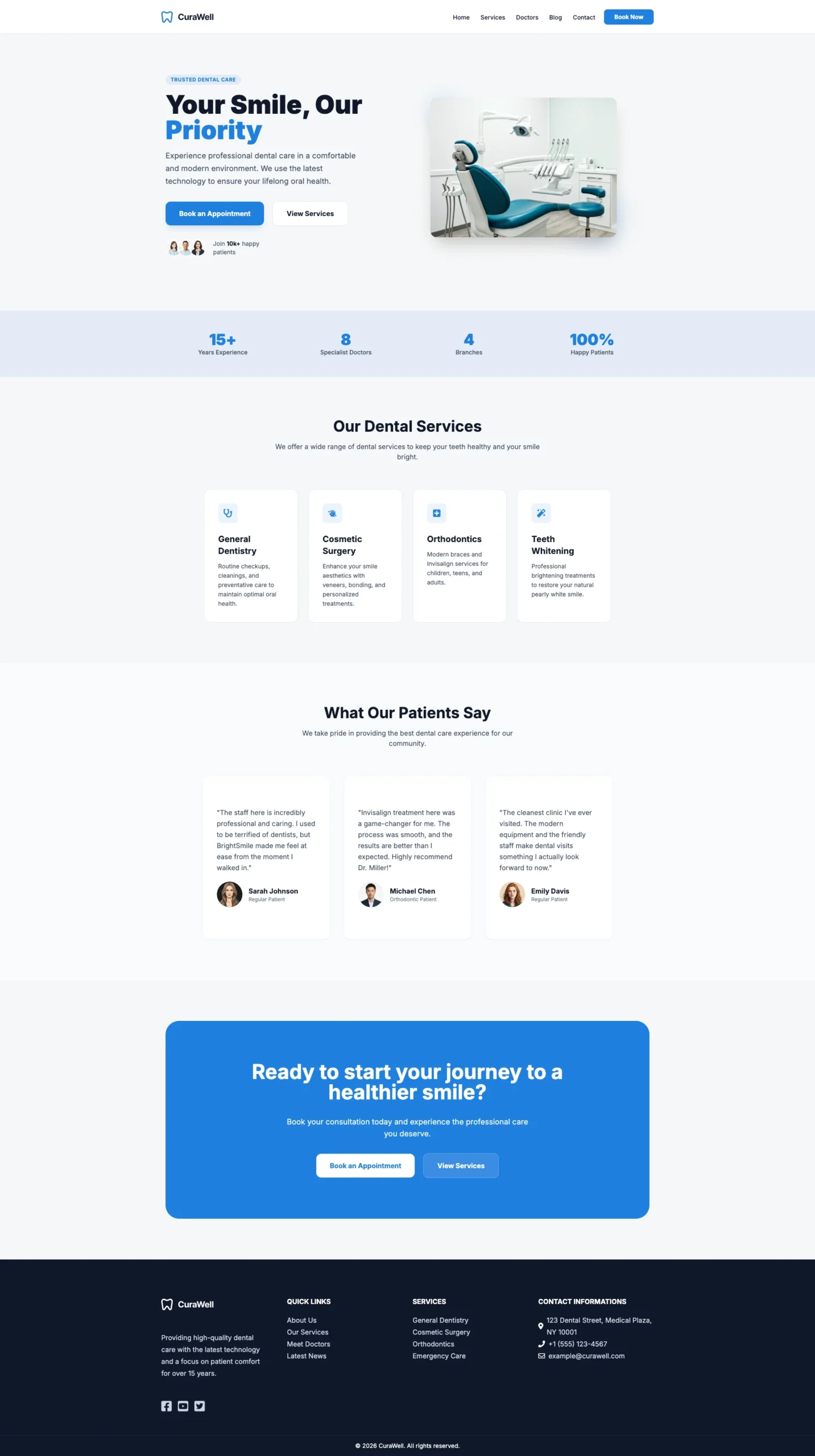 CuraWell is a lightweight, responsive WordPress theme made for dental clinics and oral care professionals. It comes with a complete demo layout, including: